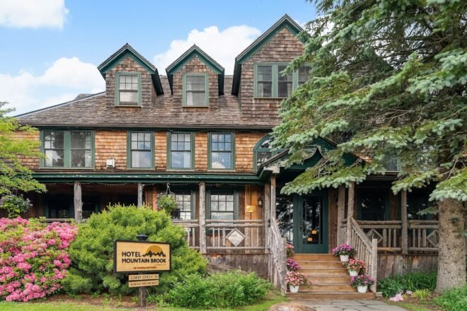 Hotel Mountain Brook located in Tannersville, New York is nestled in the heart of the Catskills, offering easy access to Hunter Mountain, Kaaterskill Falls, and local hiking trails. This charming bed and breakfast combines the cozy ambiance of a ski lodge with modern amenities, making it an ideal destination for both outdoor enthusiasts and those seeking a peaceful mountain retreat. The property features both a main house and private cabins, all within walking distance to Tannersville’s restaurants and shops.