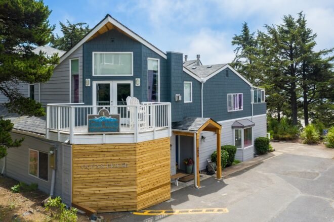 Ocean House located in Newport, Oregon sits perched along a quiet beach cove on Agate Beach, offering sweeping Pacific Ocean views. This boutique oceanfront retreat is nestled among trees overlooking the coastline, with a serene walking path that leads directly to the sand. The property features lush gardens, multiple viewing areas, and a unique crow’s nest-style fire pit deck that puts guests right on the cliff’s edge.