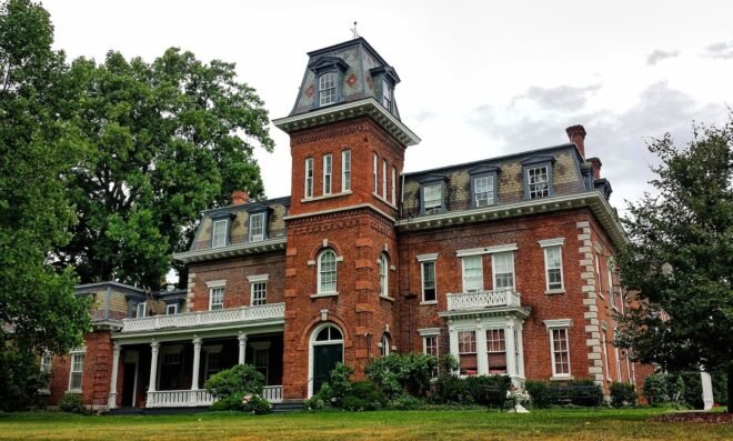 The Oneida Community Mansion House located in Oneida, New York is a remarkable historical landmark offering a unique blend of museum and lodging experience. This impressive 93,000-square-foot red brick mansion, built between 1862-1878, features Italian and Gothic revival architecture. The property sits on 33 acres of beautifully maintained grounds, complete with gardens, a vineyard, orchard, and walking trails. Visitors can explore the mansion’s rich history through guided tours while enjoying modern amenities. The location is conveniently situated less than 4 miles from Turning Stone Casino and near dining options in Oneida, Sherrill, and Vernon.