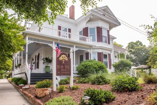 The Pecan Tree Inn Bed and Breakfast located in Beaufort, North Carolina sits in a prime location just one block from the waterfront. This charming historic home is perfectly positioned within walking distance to Front Street’s shops, restaurants, and the scenic boardwalk. Visitors can easily access local attractions including untouched beaches, a lighthouse, and areas for wild horse viewing. The property features beautiful grounds with a peaceful koi pond and multiple outdoor sitting areas.