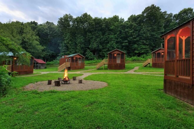 Ravenwood Castle located in New Plymouth, Ohio offers a unique medieval-themed getaway nestled in the rolling hills near Hocking Hills State Park. This enchanting property features a castle-style main building with themed rooms, plus separate cottages and cabins spread across wooded grounds. Located about 25-30 minutes from major Hocking Hills attractions, this bed and breakfast provides a secluded escape perfect for those seeking an immersive, off-the-grid experience.
