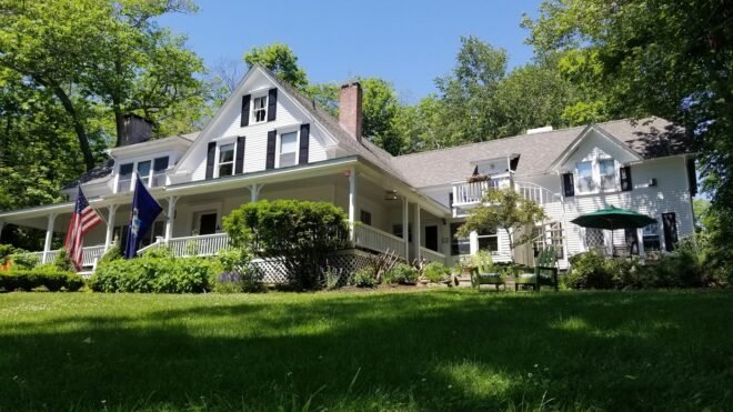 The inn provides a serene and cozy environment with its warm, inviting front porch overlooking the bay. Beautiful paintings adorn the stairway, and a gas fireplace in the living room creates a comfortable gathering space. Visitors particularly appreciate that the inn sits well back from High Street, ensuring a peaceful stay even when fully occupied. The property maintains a quiet, romantic atmosphere that’s perfect for couples seeking a relaxing getaway. The wrap-around porch offers tranquil views and serves as a favorite spot for guests to unwind.