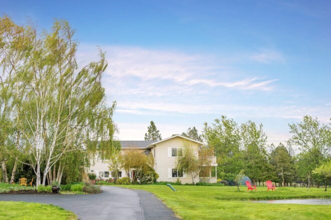 The Trumpeter Inn Bed & Breakfast located in Friday Harbor, Washington offers a charming retreat just minutes from downtown. This quaint property sits on beautiful grounds featuring an orchard, perennial gardens, and native Pacific Madrone trees. The inn serves as an ideal home base for exploring San Juan Island, with easy access to local attractions and outdoor activities. A unique highlight is the on-site alpaca and pygmy goat farm, where guests can feed the animals with complimentary food provided by the innkeepers.